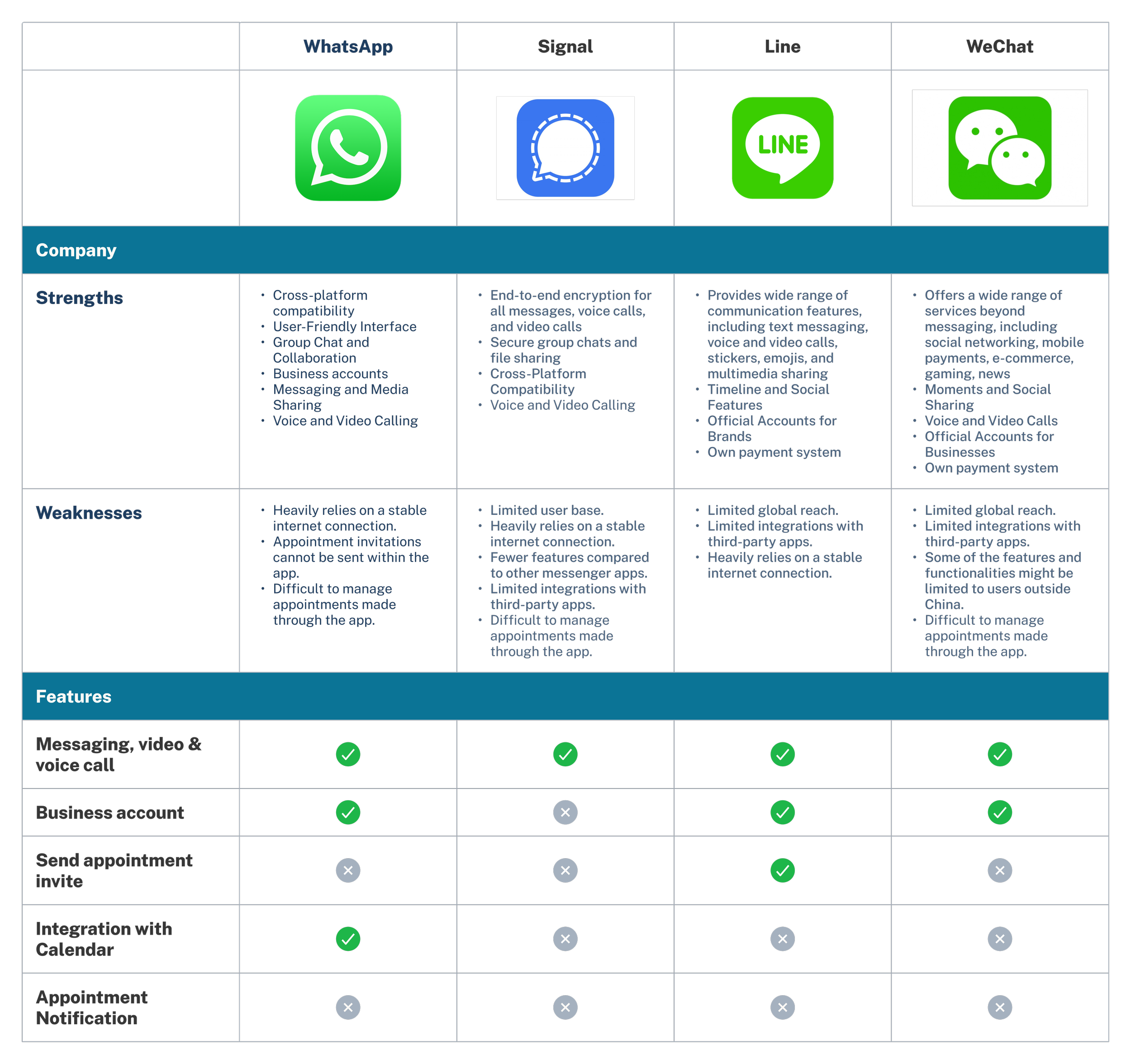 A competitor analysis was conducted among 3 direct competitors - Signal, Line and WeChat, considering their target audience, strengths, weaknesses, and features.